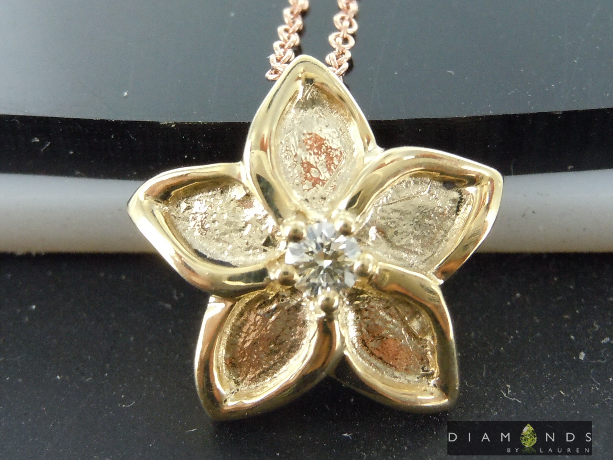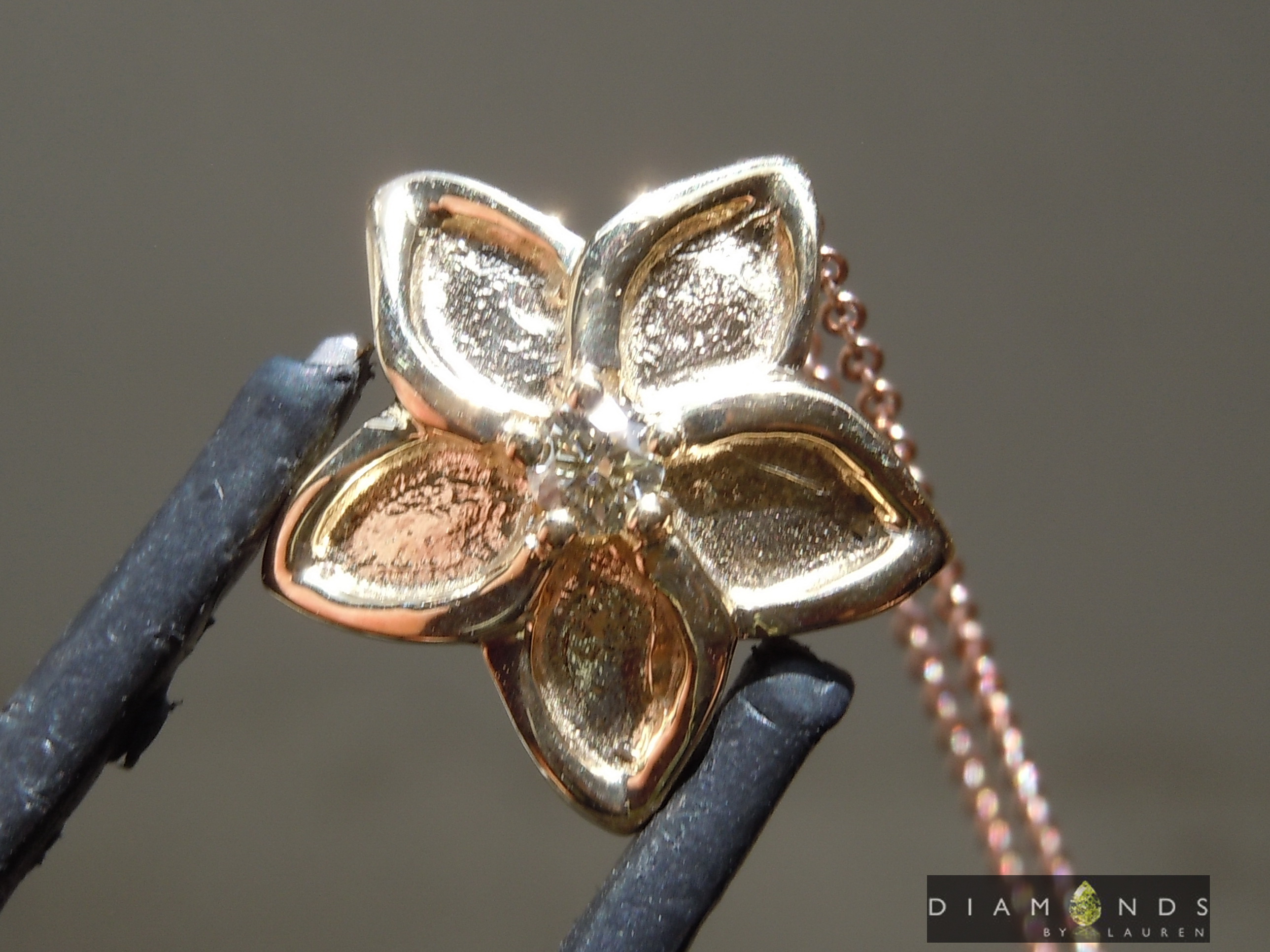 This lovely flower is solid 14kt yellow gold. It measures 1/2 inch across. The diamond is a Natural Fancy Colored Diamond. It's a special piece.