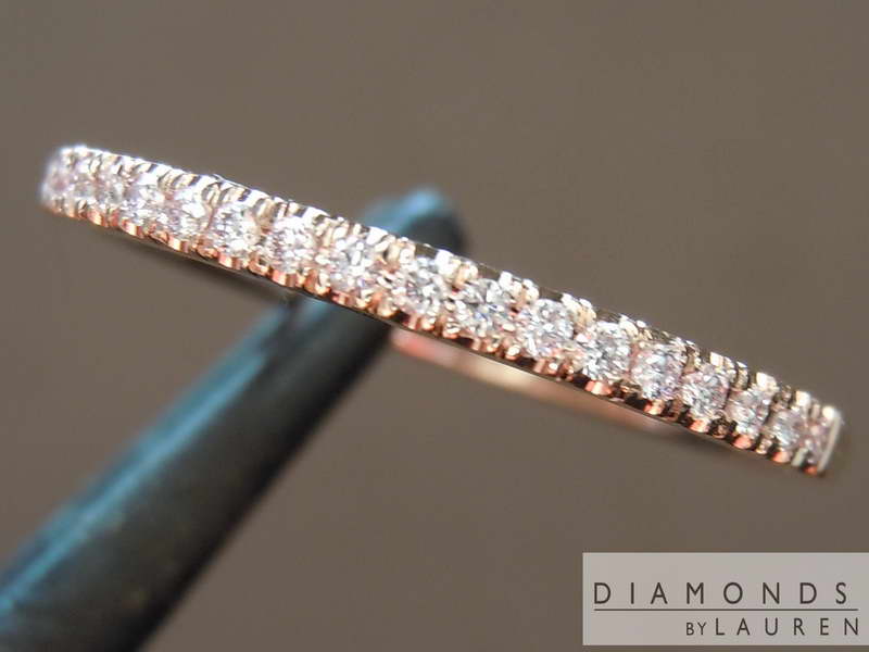 Oh My Goodness! A super skinny stackable pink diamond band- at an amazing price! We're using some very sweet natural pink diamonds. As small as they are, they still show pink! Our custom made ring is 1.5mm- so it's very very dainty. We can make one of these for you in any finger size.