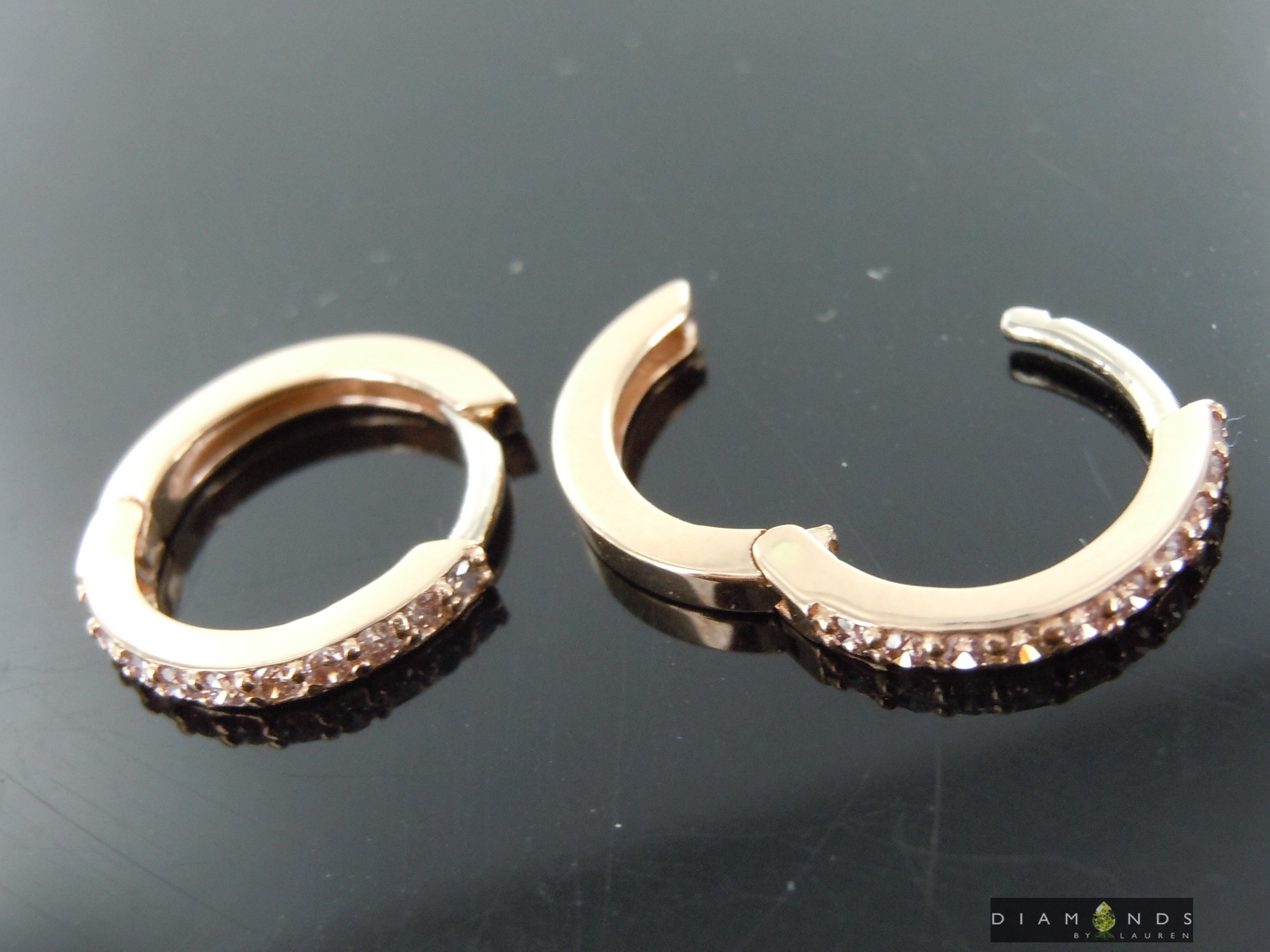 These are the perfect "huggie" style hoop earrings. Done in 14kt rose gold and set with well cut natural Fancy Pink Diamonds. They are about 1/2 inch in size. The earrings have a hinged setting that lock into place. They are perfect for daily wear!