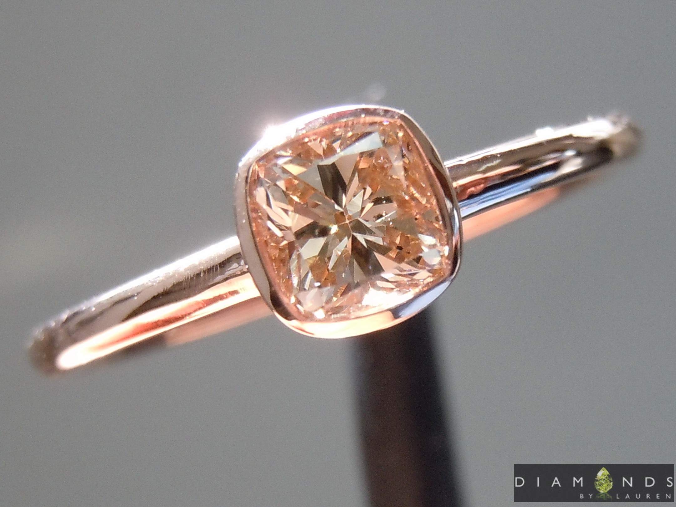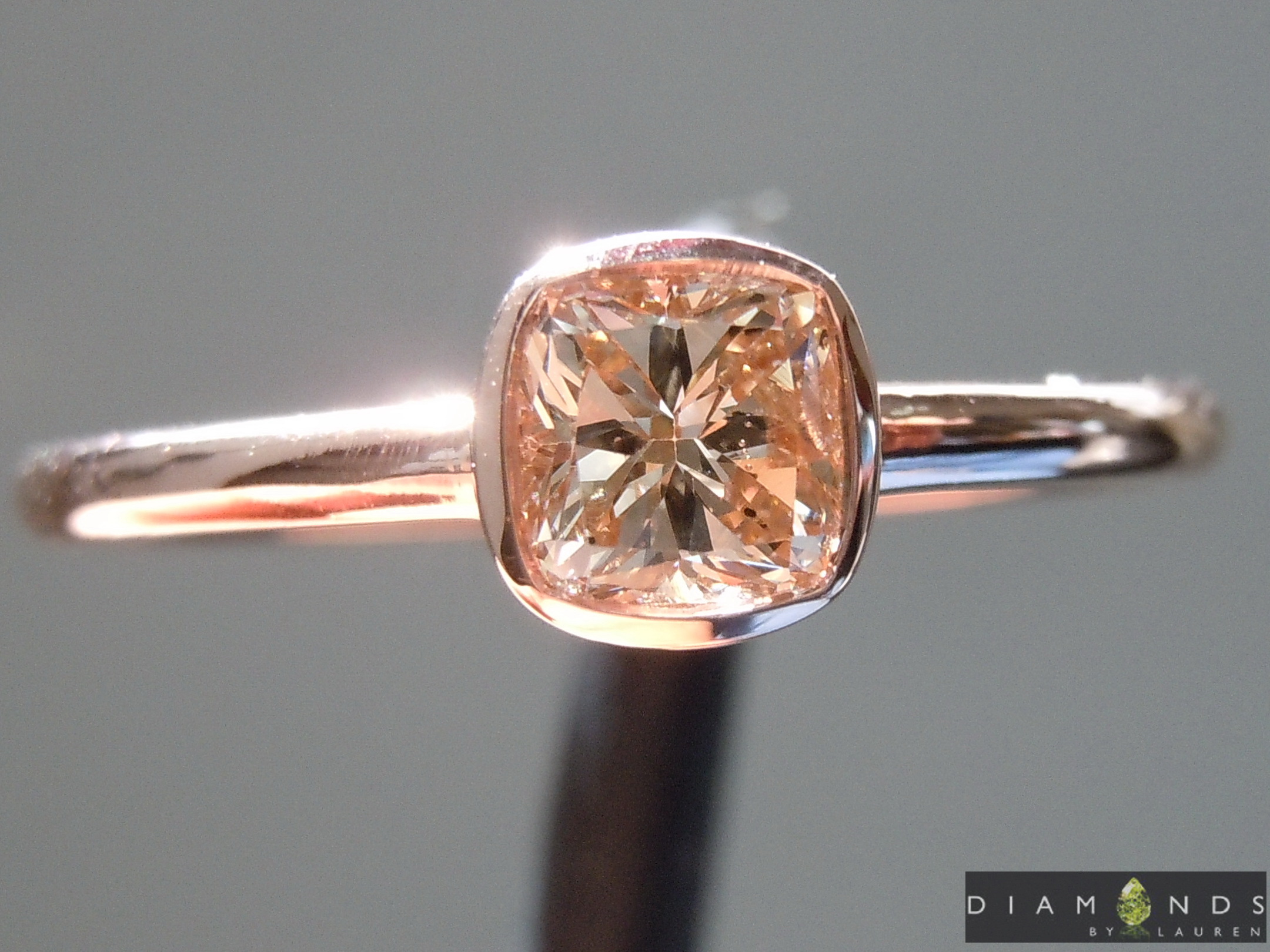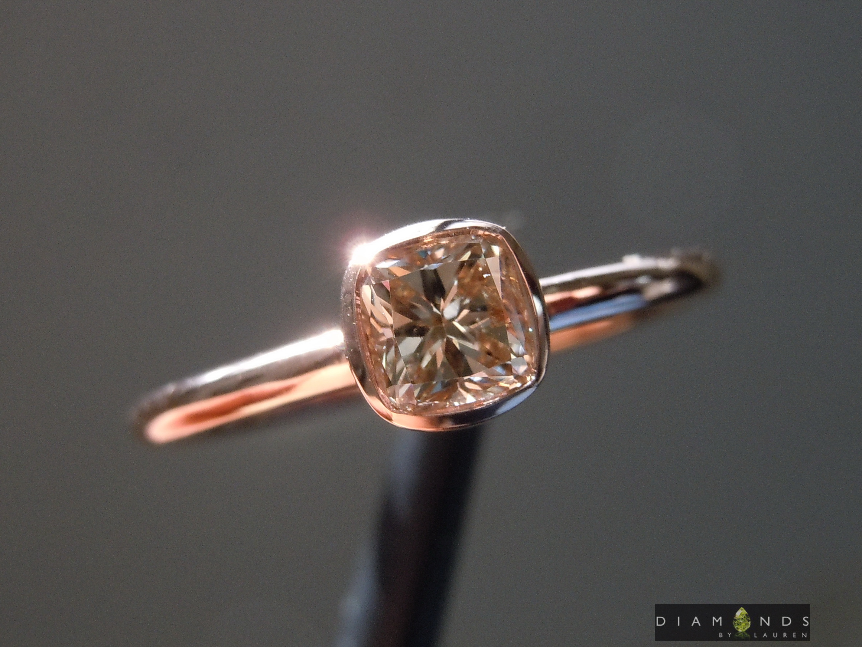 Nicely Cut cushion - in an attractive light brown color. There's a lot of sparkle and flashes. We've set this beauty into a custom made rosy gold bezel ring, with a dainty 1.5mm shank. Who could ask for more?