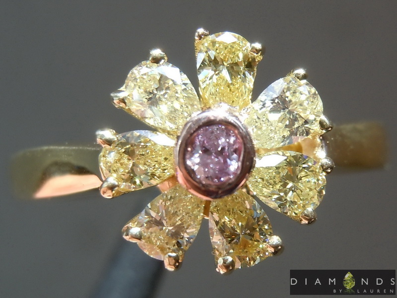 We found a sweet parcel of natural fancy Colored Diamonds containing remarkable pink diamonds. The center diamond in this ring is bright purple pink. The sparkle is amazing for a stone of this size and color.