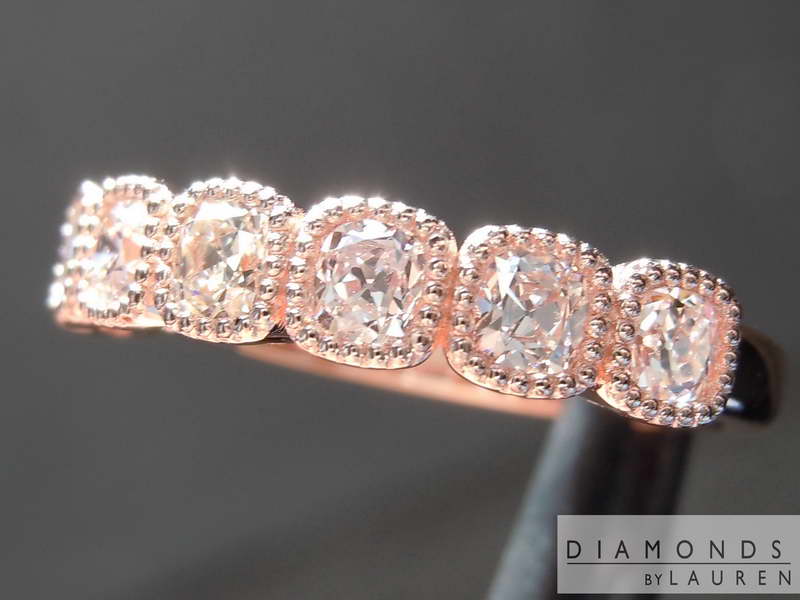 ITEM:# R8508 CENTER STONE: TOTAL WEIGHT: 0.78cts QUANTITY: 7 SHAPE: Old Mine Brilliant COLOR:E-F-G CLARITY: VS MEASUREMENTS: 3.10 x 2.90 mm MOUNTING: 14 Karat Rose Gold