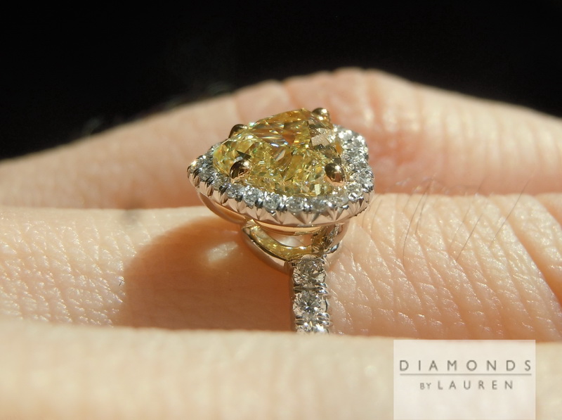 The diamond is set into one of our top of the line "Uber Halo" rings so now it looks like a Fancy Yellow, or even Fancy Intense Yellow.