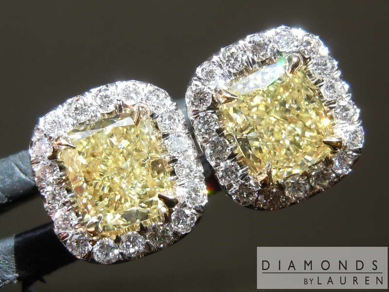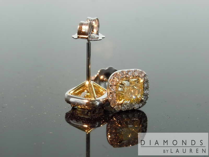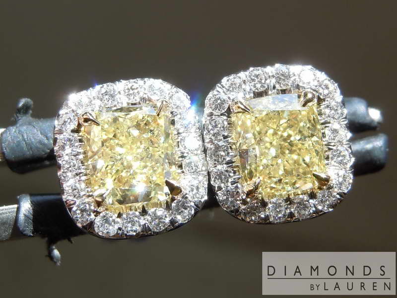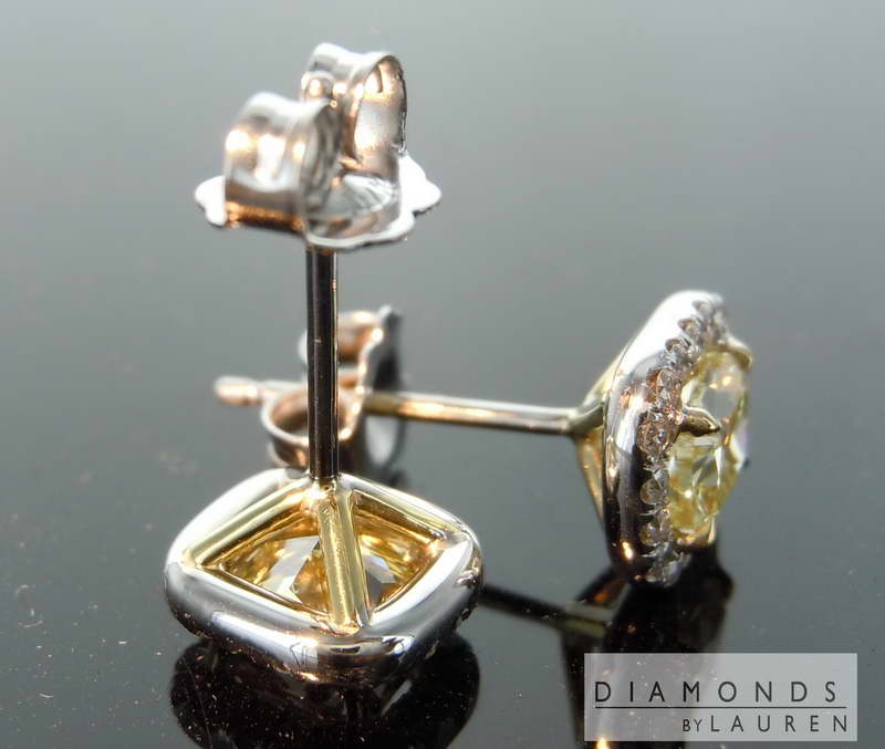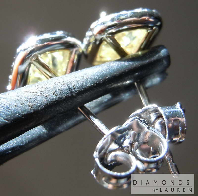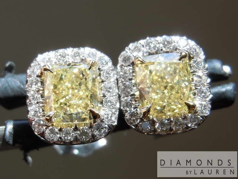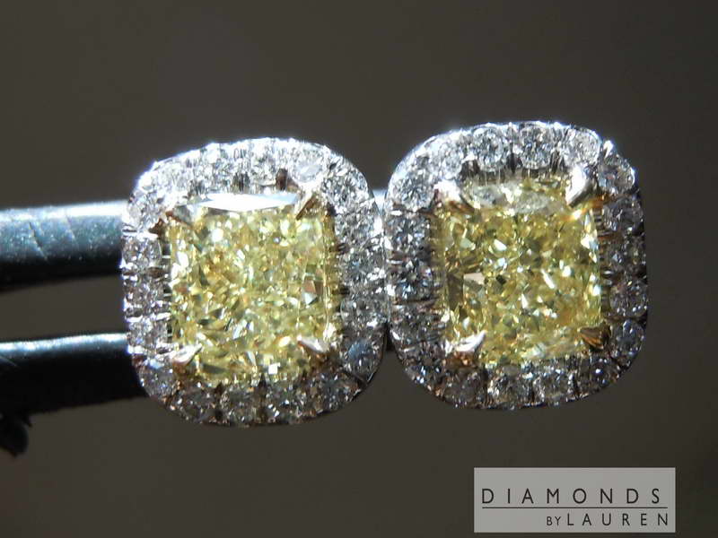 Here is a pair of earrings for someone looking for a pair of "no excuses" Fancy Yellow diamonds. More on the stones below. The halo settings are hand forged and fit the diamonds perfectly.