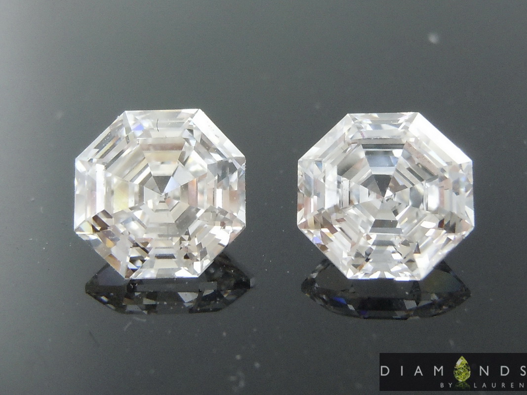 Here's a perfectly cut pair of Octagonal Step Cuts. They match exactly. Both are totally colorless - I graded them E, but they could be D. Both are clean. Both are exactly 5.55mm x 3.2mm This is such a stunning pair. We've included custom made Stud Earrings in 18kt white gold.