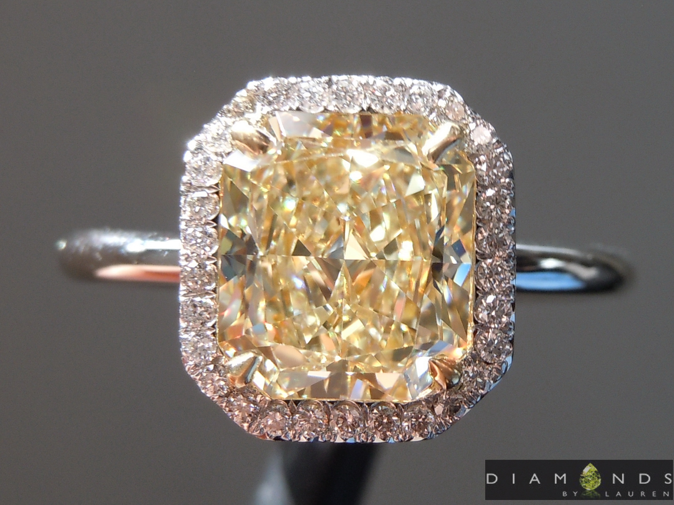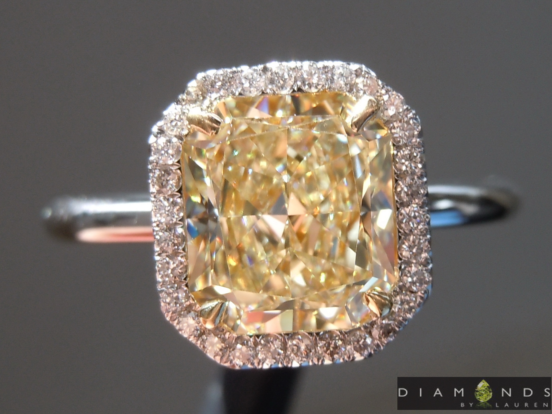 I mean it's clearly yellow, just light yellow. It could be argued that this light lemon yellow color is more attractive than darker yellows, or colorless diamonds, both of which cost a heckuva lot more. In this case, the color looks amazing on this rectangular radiant. The shape is accentuated by dramatic corners - I love the angles they create in the facets and sparkle.
