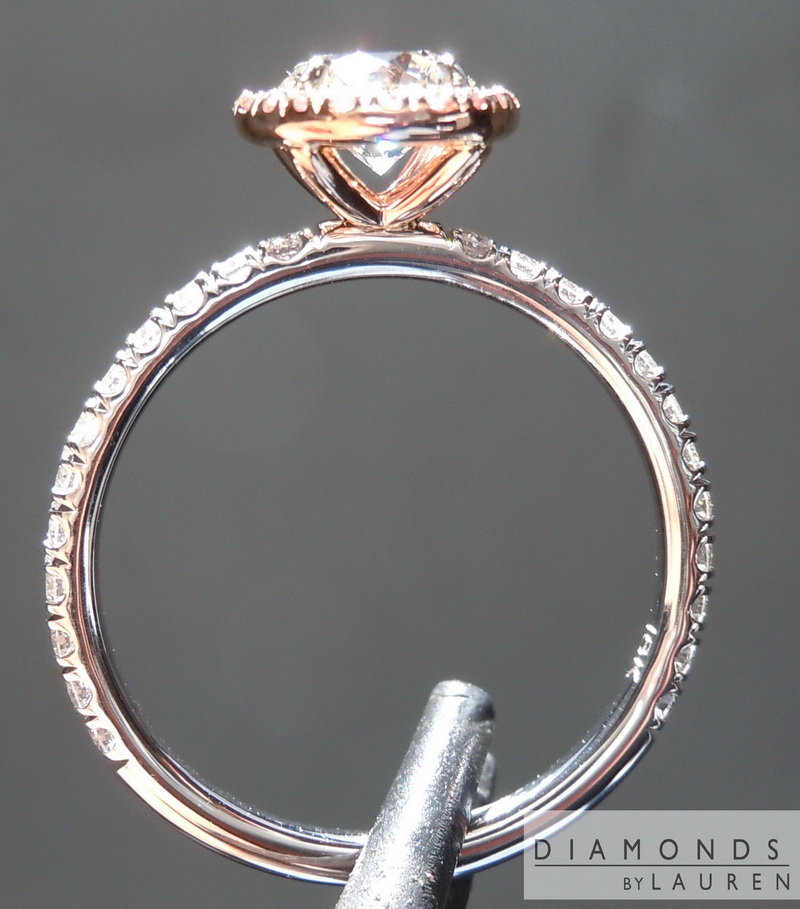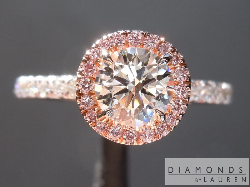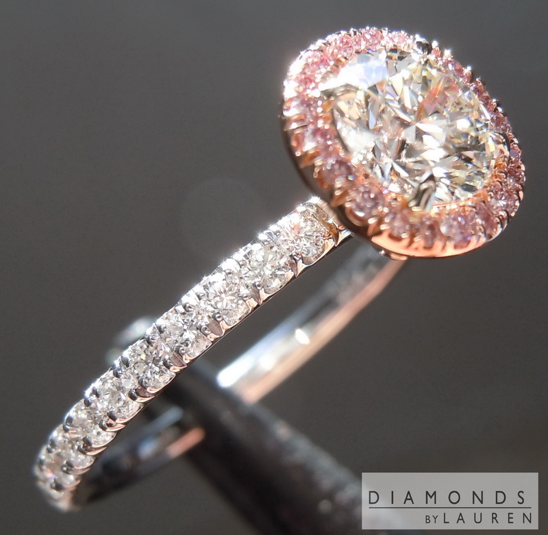 I LOVE how this J color looks in this setting! The contrast with the pink halo diamonds gives the center diamond a perfect environment in which to shine. You really don't notice the J color- you just get all these bright reflections off the center. THe pinks sparkle as well- but in a difernt way. The diamonds on the shank finishj the entire project off with a bang. They provide super sparkle too.